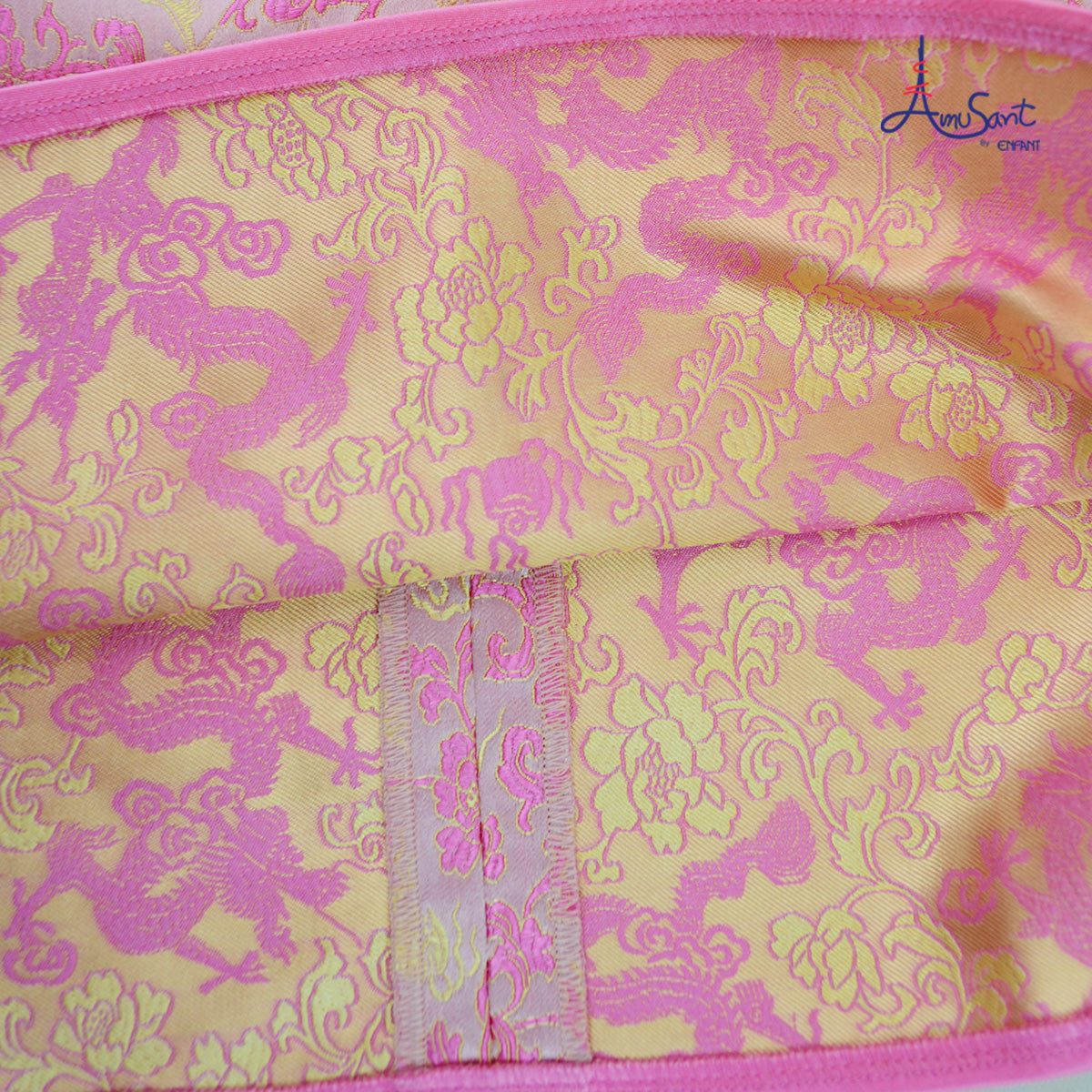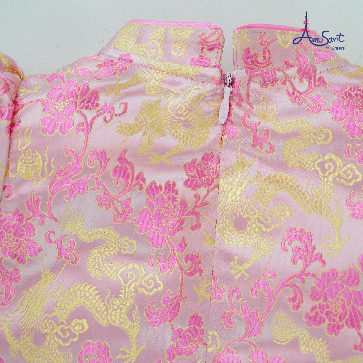 ด้านหน้าแต่งกระดุมจีนน่ารัก ปลายแขนและชายกระโปรงแต่งกุ้นแลปสีชมพูหวานๆ ด้านหลังมีซิปยาวถึงกลางหลัง