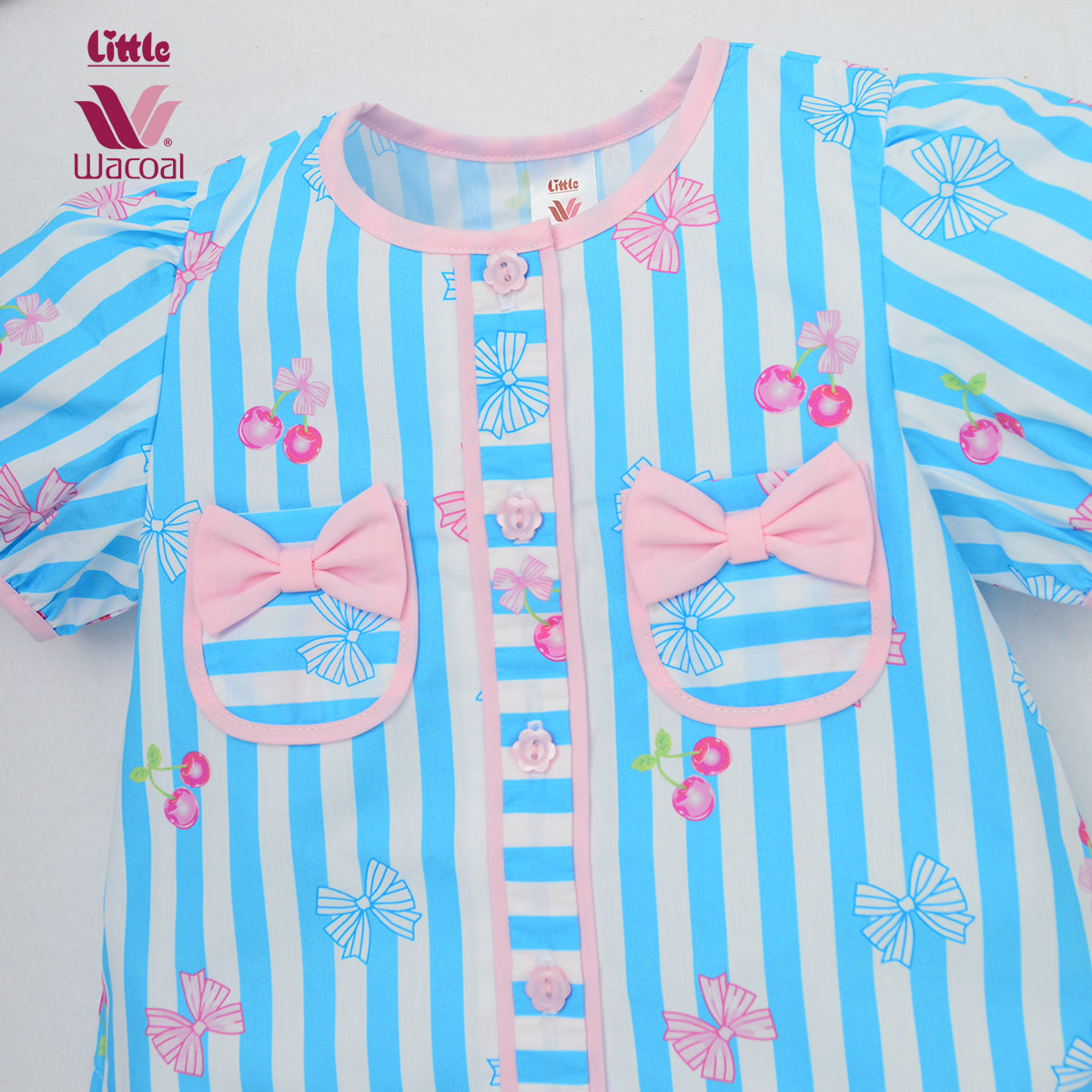 ลายทางฟ้า-ขาวสลับกับลวดลายโบว์และลูกกวาด มาพร้อมดีเทลสุดน่ารักด้วยกระเป๋าโบว์คู่ด้านหน้า 💕